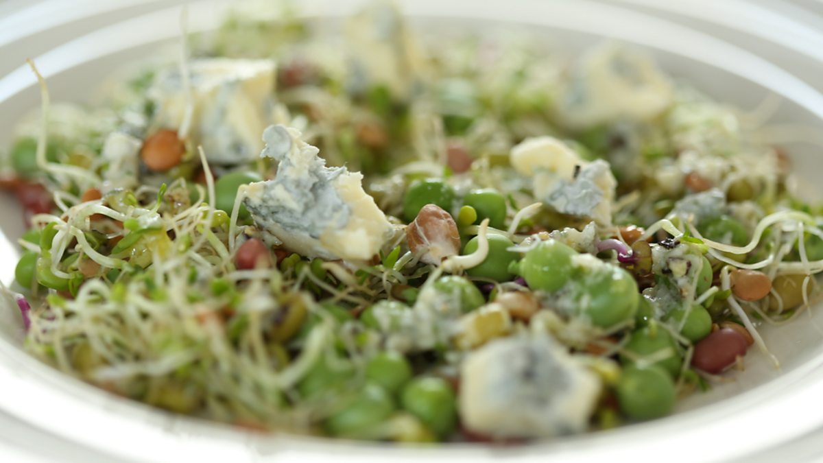 Sprouting vegetables, peas and blue cheese