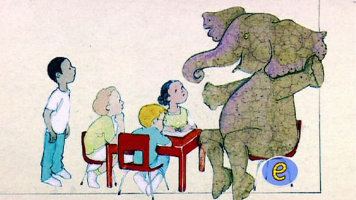 In 'Fun with Phonics' we hear a short illustrated story about an elephant in school, involving repetition of the initial sound 'e'.