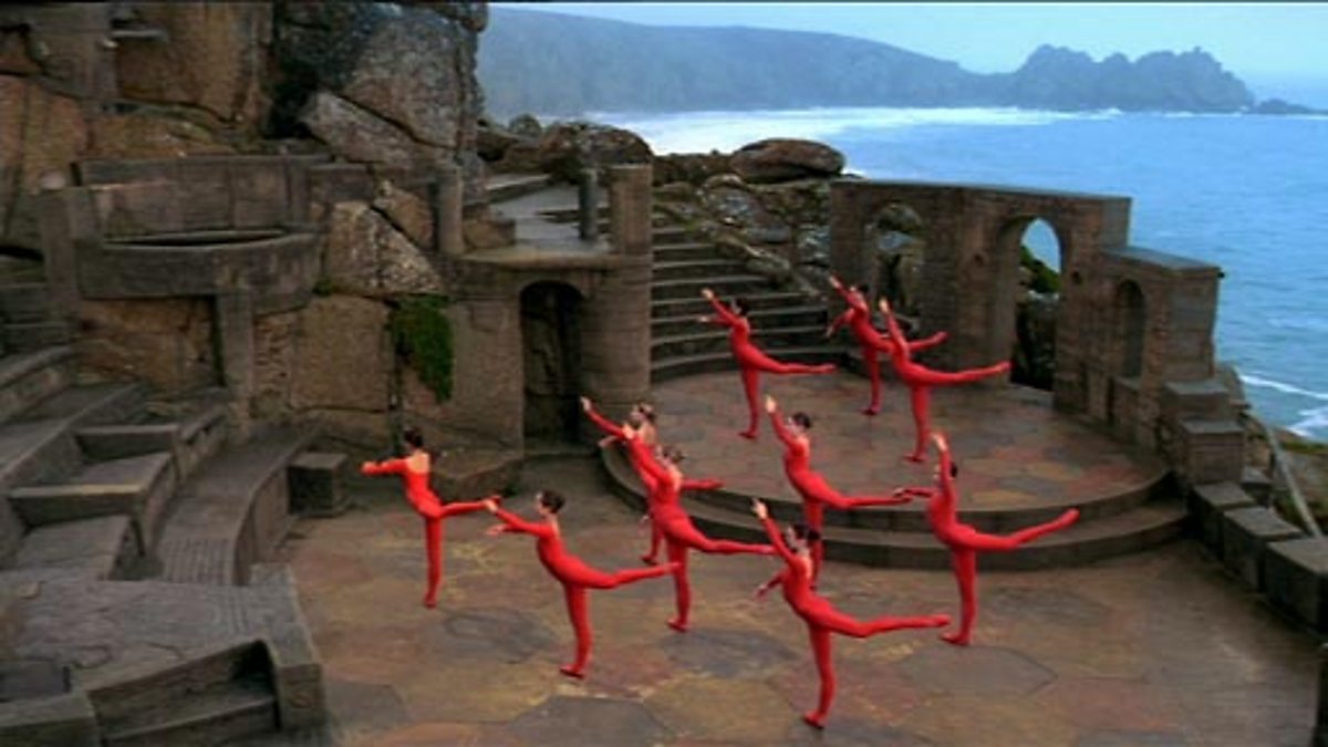 Ten ballet dancers in red perform a slow, precise sequence of movements in the Minack open air theatre, accompanied by a string quartet with prominent cello. The dramatic Cornish landscape in the background adds to the atmosphere of sombre drama.