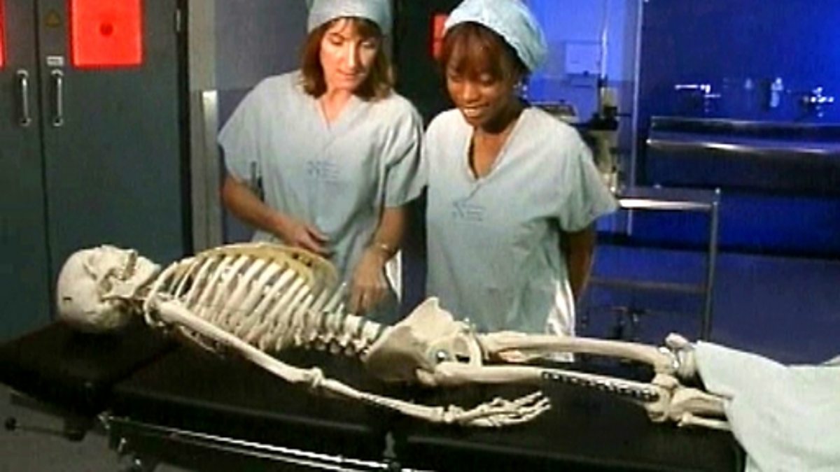 The presenter talks to a doctor about the use of metals in the human body. They look at the X-rays of a swimmer with metal implants in her legs. The presenter wants to know why gold, the least reactive metal, is not used for implants. The doctor explains it is used for teeth, but is too soft for holding bones together - for this task, titanium is used. Titanium is more reactive than gold but forms a protective, harmless and stable oxide layer when exposed to oxygen.