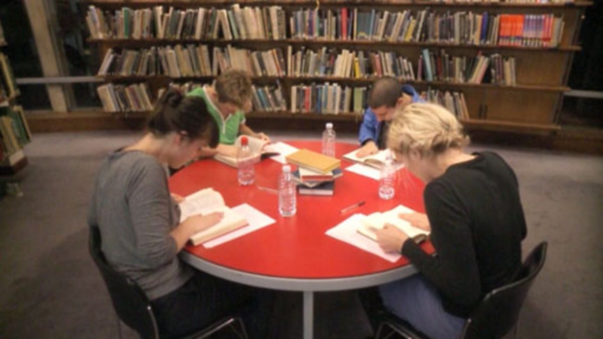 The quiet sanctuary of the library is the backdrop for a series of dance movements based on a literacy theme. The library might appear quiet and still, but there is movement here. Readers turn pages. Sitting around a table, a group tussle over books. Behind the stillness is the private world each reader inhabits and here those moments are acted out. There's the temptation to bend the rules and break the silence, to make books into stepping stones and to turn the spiral stairs into a cascade of books.