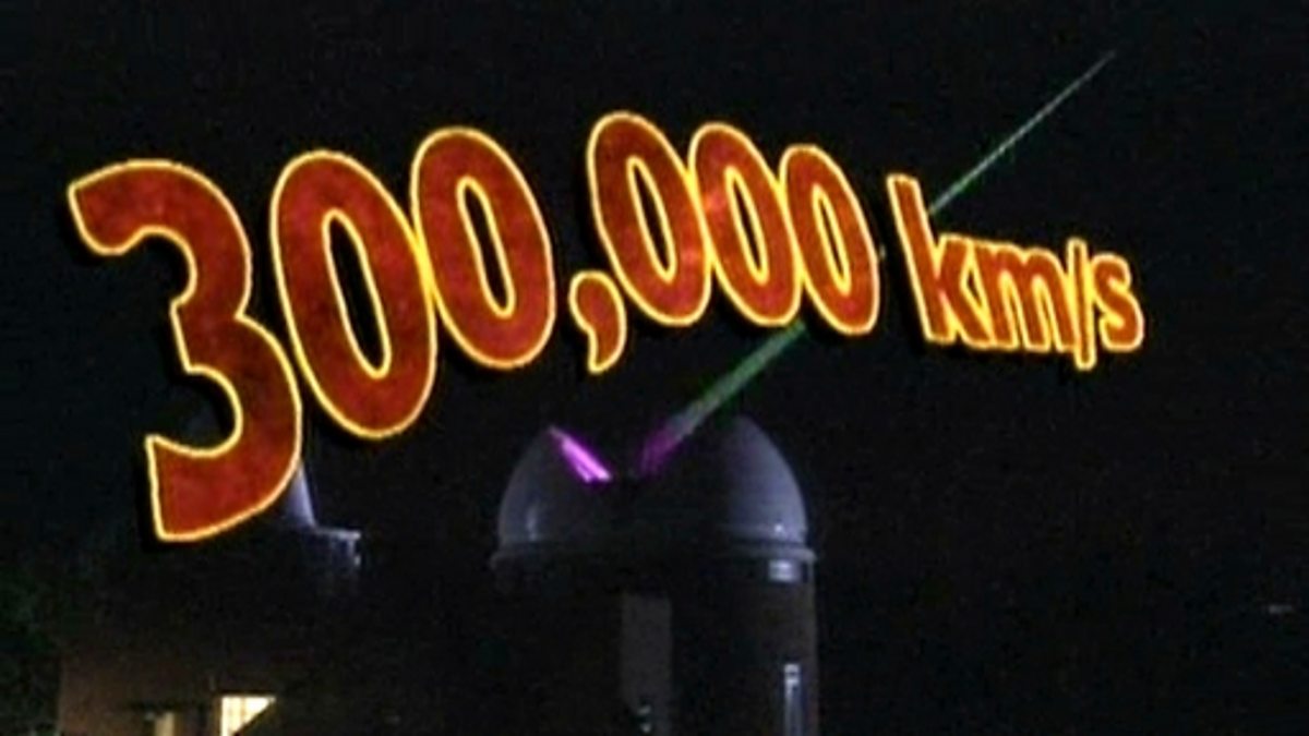 The presenter and an expert fire a beam of laser light at a satellite orbiting the Earth. The laser light is reflected off the satellite and returns to the observatory, where the time it takes to complete the round trip is measured. It takes approximately 1/7th of a second. Knowing the round trip distance to the satellite is 40,000 km, the speed of light can be calculated.