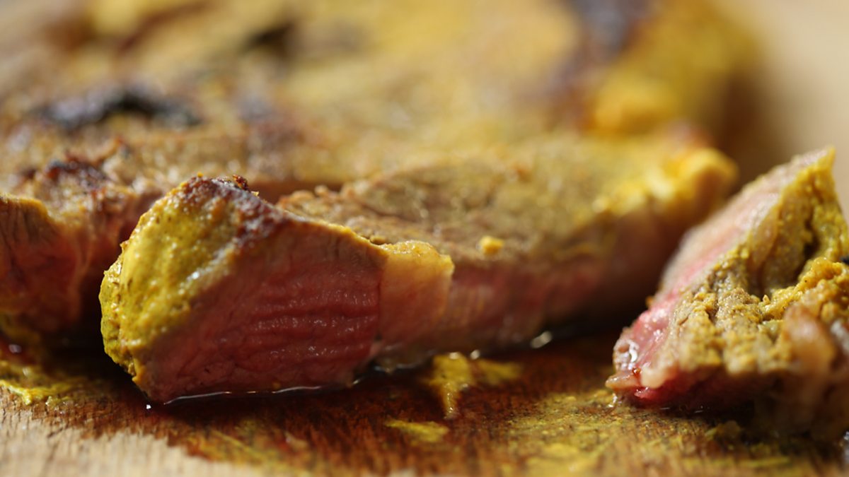 A spicy yoghurt marinade tenderises rump steak - a cut that is full of flavour.