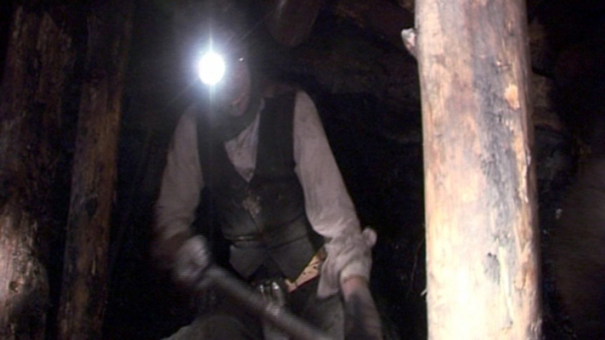 Coal House: a reconstruction showing coal miners working underground in 1927. Miners' had to do difficult and dangerous jobs and endure cramped conditions for long hours. The commentary explains miners' low life expectancy and the prevalence of mining related illnesses at the time.