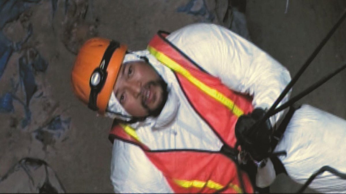 Picture: Forensic anthropologist Fredy Peccerelli is lowered towards a mass grave.