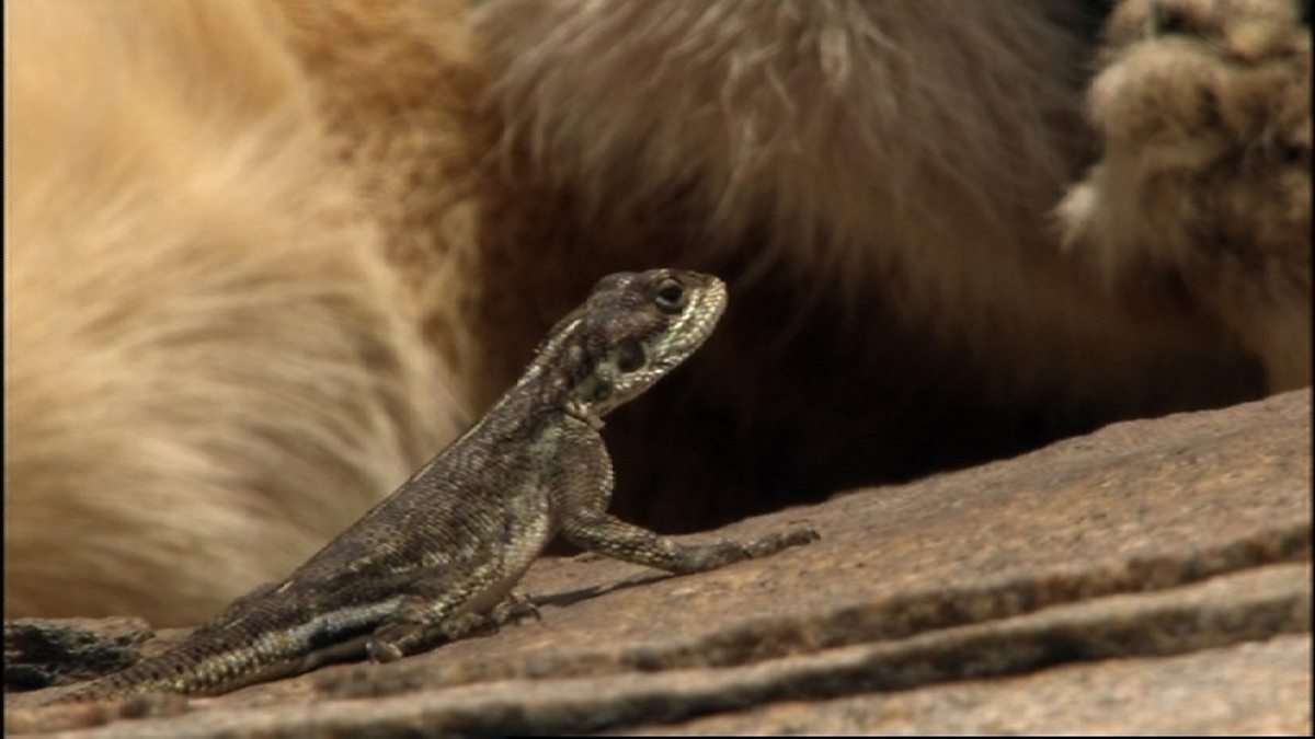 It takes courage for an agama lizard to hunt flies on the back of a sleeping lion.