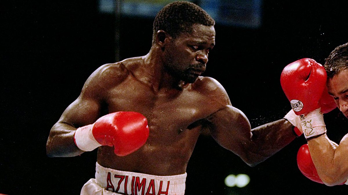 (Image of Azumah Nelson trading blows during a bout in Las Vegas, Nevada. Getty)