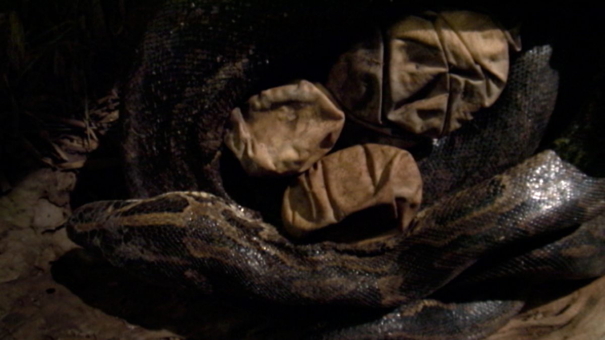 A female African rock python nearly kills herself in order to warm her clutch of eggs.