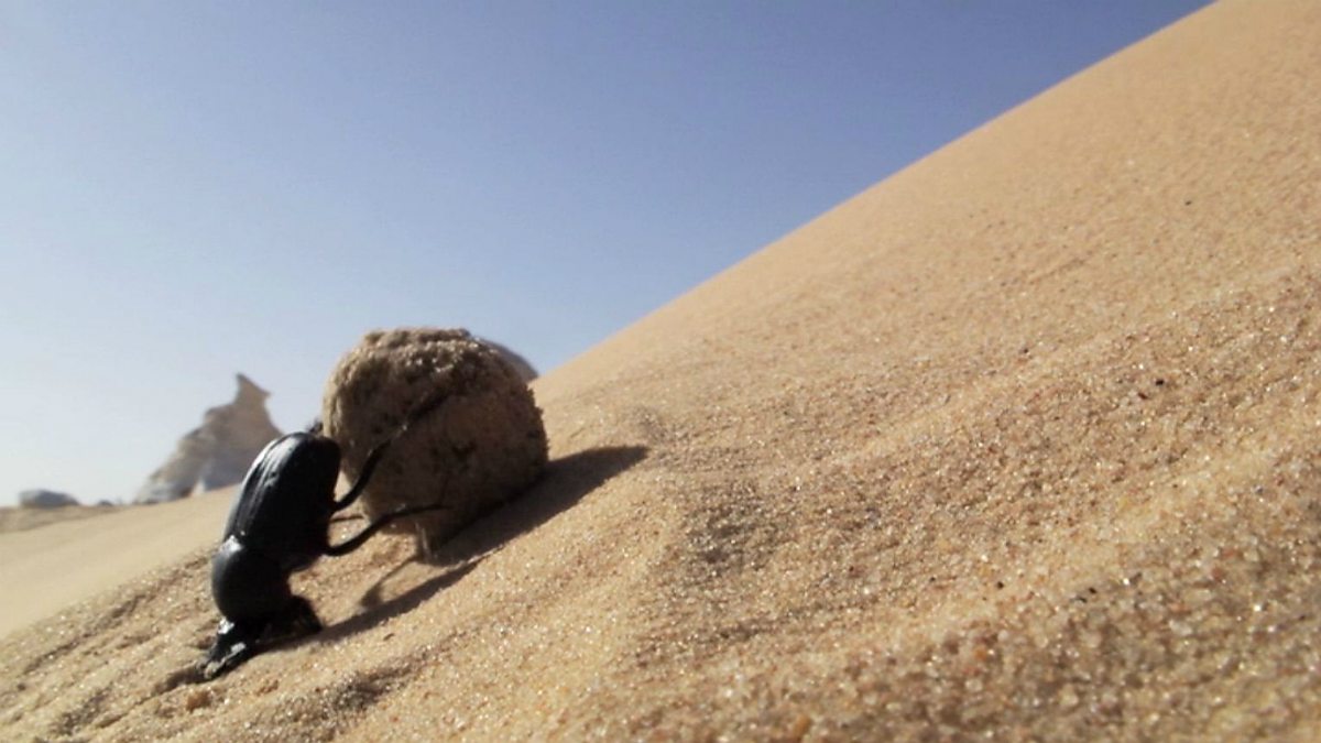 A dung beetle gets stuck rolling a ball of dung between two sand dunes.