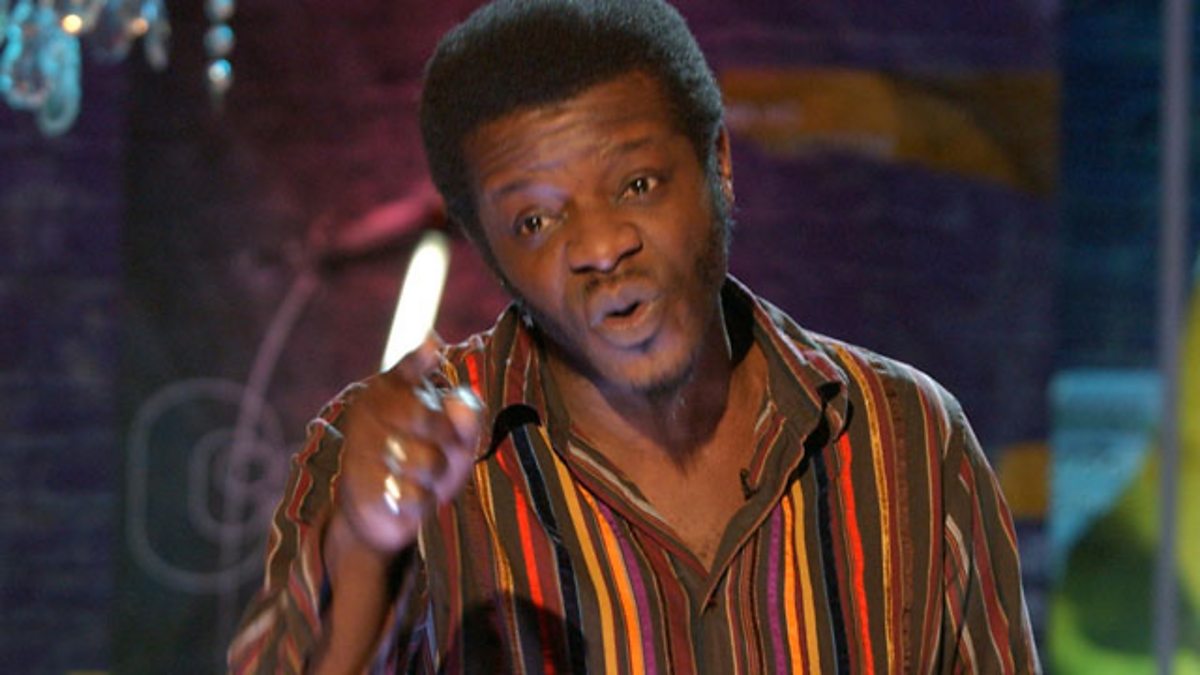 Stephen K Amos gives a cheeky young audience member a lesson in (almost) retro gadgetry.