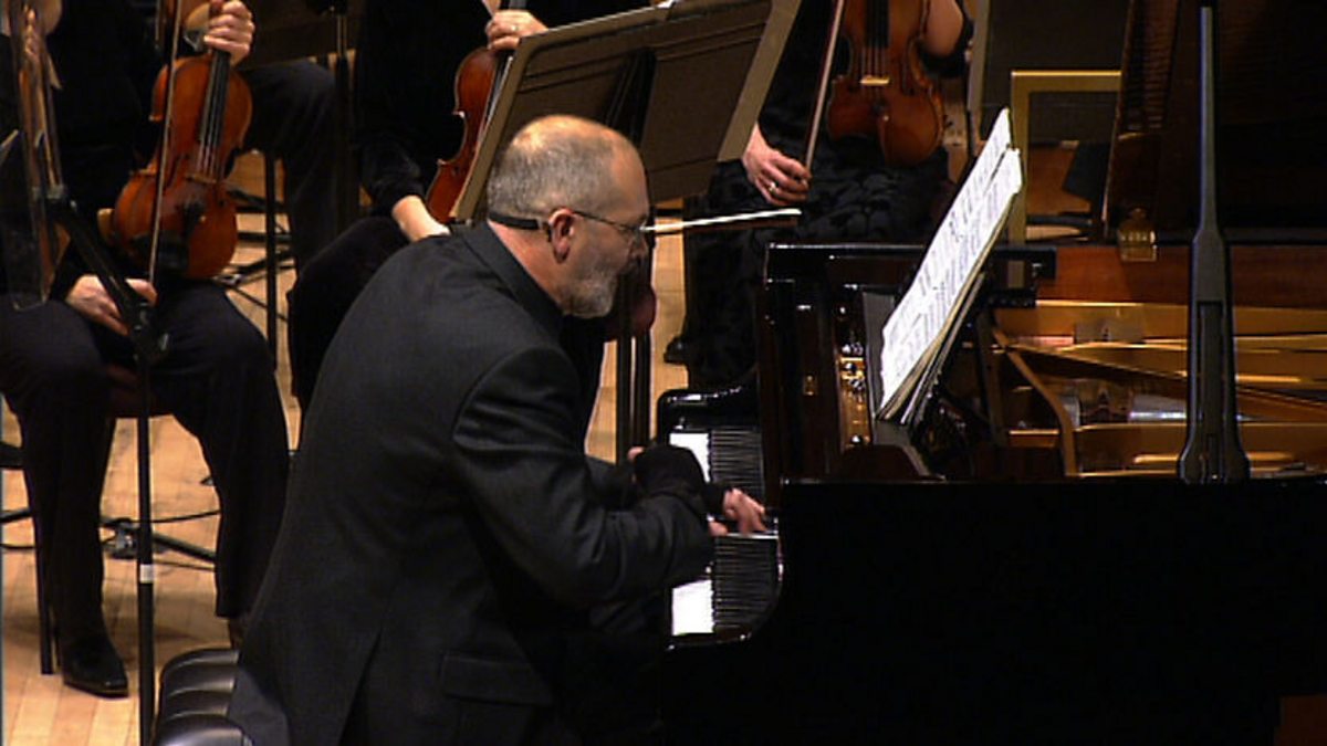 Philip Mead performs a complicated piano solo in the first movement of Henry Cowell's Piano Concerto with the BBC Symphony Orchestra.
