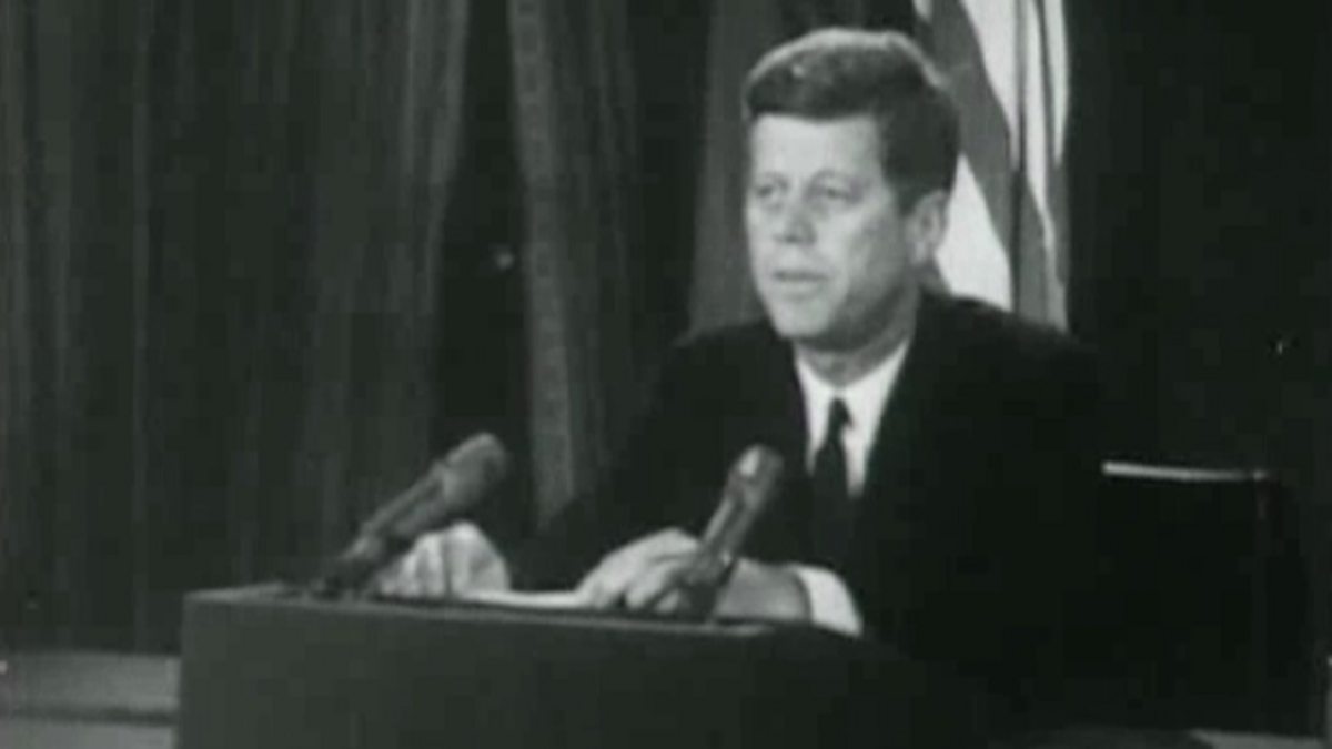 President Kennedy gravely announces details about the Soviet arsenal building up on the island of Cuba, citing unmistakable evidence gathered by US surveillance operations. Not all of Kennedy's speech is captured in this recording. He went on to outline the striking capabilities of the missiles and points out that bases are also being prepared for bombers, making it possible for the eastern USA to be attacked within minutes.