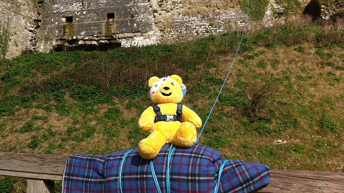 Pam White of National Trust Corfe Castle helps Pudsey complete his zip wire challenge