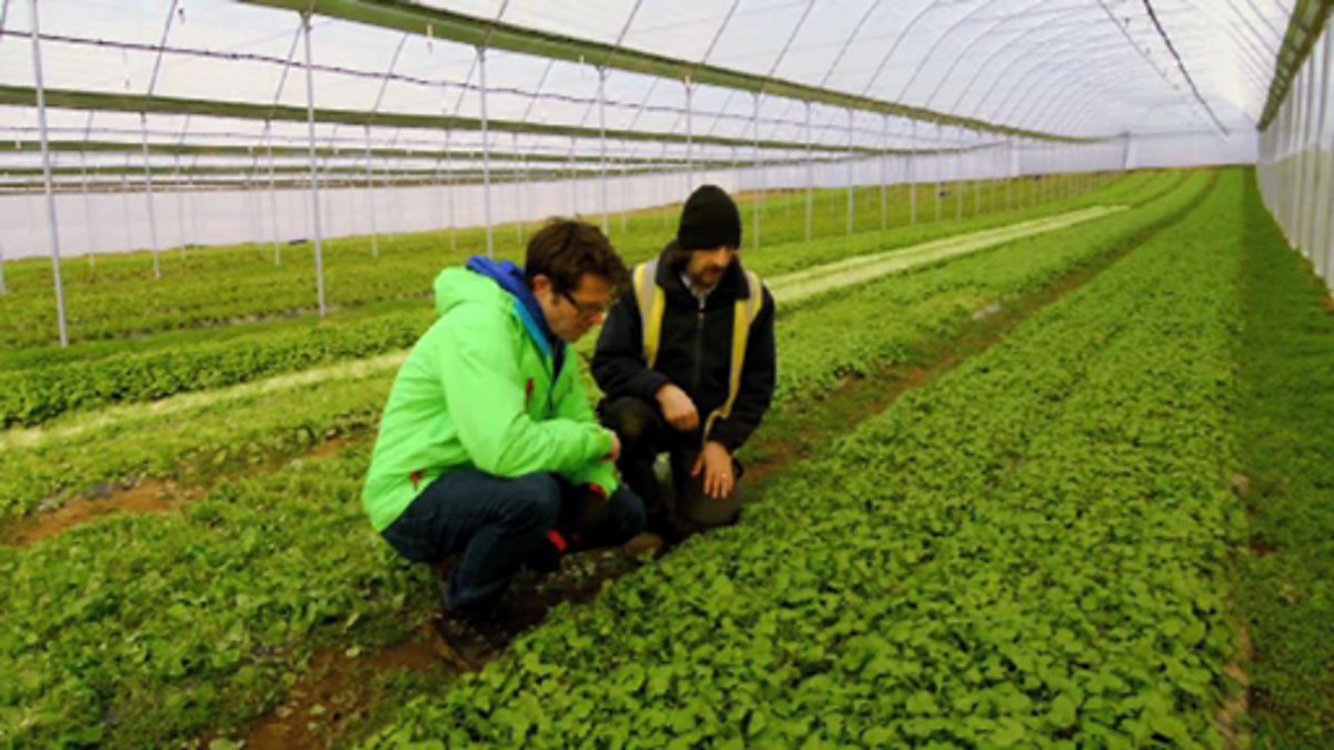 Stefan Gates visits an organic farm in Devon and follows the journey food takes from the field to our plates. Stefan helps pick spring greens in the field and tastes different salad vegetables. At the farm we see how the salad leaves are mixed together in the correct proportions to get a balance of tastes. We see the mixed salad being weighed and packed into bags using a machine. Stefan helps pack all the different vegetables into boxes before they are delivered locally.