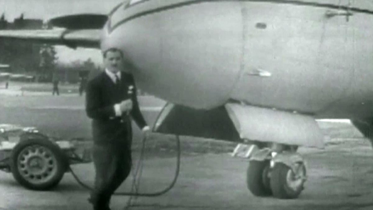 The first of two experimental broadcasts from a Vickers Varsity in flight over Norfolk. Cameras from the cockpit and the bomb aimer's compartment, supplemented by cameras on the ground, capture the plane taking off and landing, as well as other aircraft, such as a Lincoln, Canberra and Meteor NF12, flying alongside.