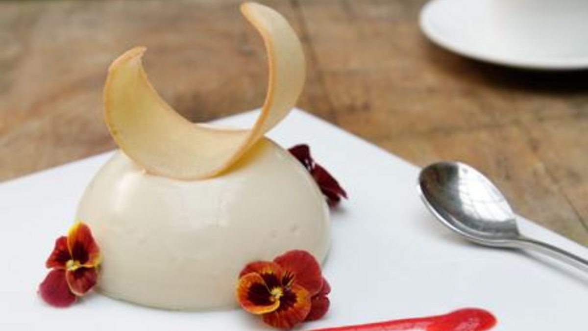 Green tea panna cotta with cardamom tuile biscuits