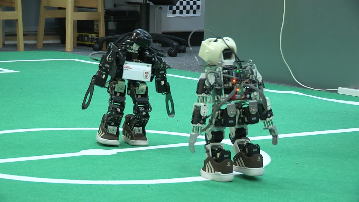A football match is played between two teams of robots, one under remote control by people, the other under autonomous computer control. For computer control, complex situations must be simplified; for example the robots ‘see’ by looking at the edges between distinct colours and positions are tracked through co-ordinates. The computer program is highly complex but made up of a number of functions, such as one that uses if/ then selection to determine the robot’s movement.