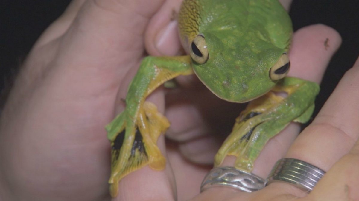 Bill watches Wallace’s flying frog - with feet as parachutes - falling with style.