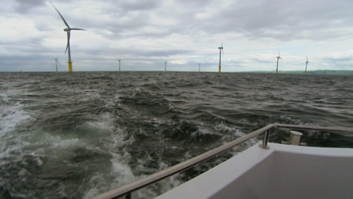 Footage of North Hoyle offshore wind farm, off the coast near Rhyl in North Wales with a close up of the turbines and discussion on the future of wind power.