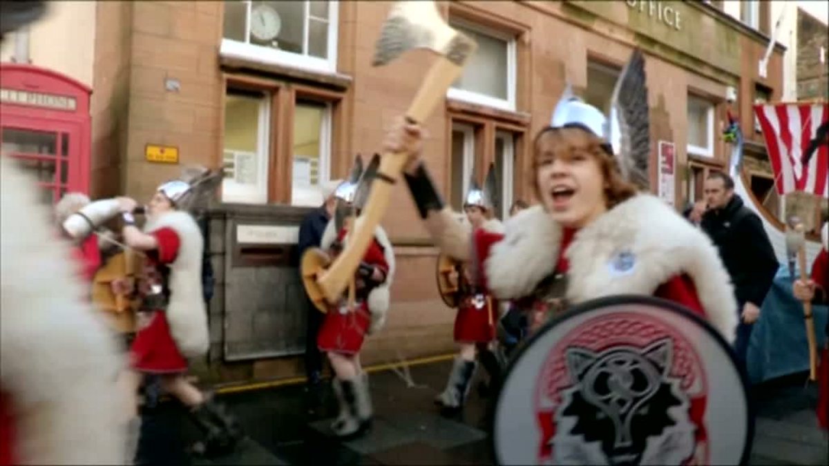 Lenny Allan is 2013 Junior Jarl who leads the junior squads and procession on the day of the Up Helly Aa fire festival. He guides us through his day as chief Viking, including visits to schools and marching through the streets of Lerwick before finishing with a fiery torchlit procession to burn a Viking longship. Lenny explains the sigificance to him of being part of the festival and its importance in the community. The organised schedule of the day that we see illustrates the formalisation that the Victorians made to the festival that has lasted through generations.