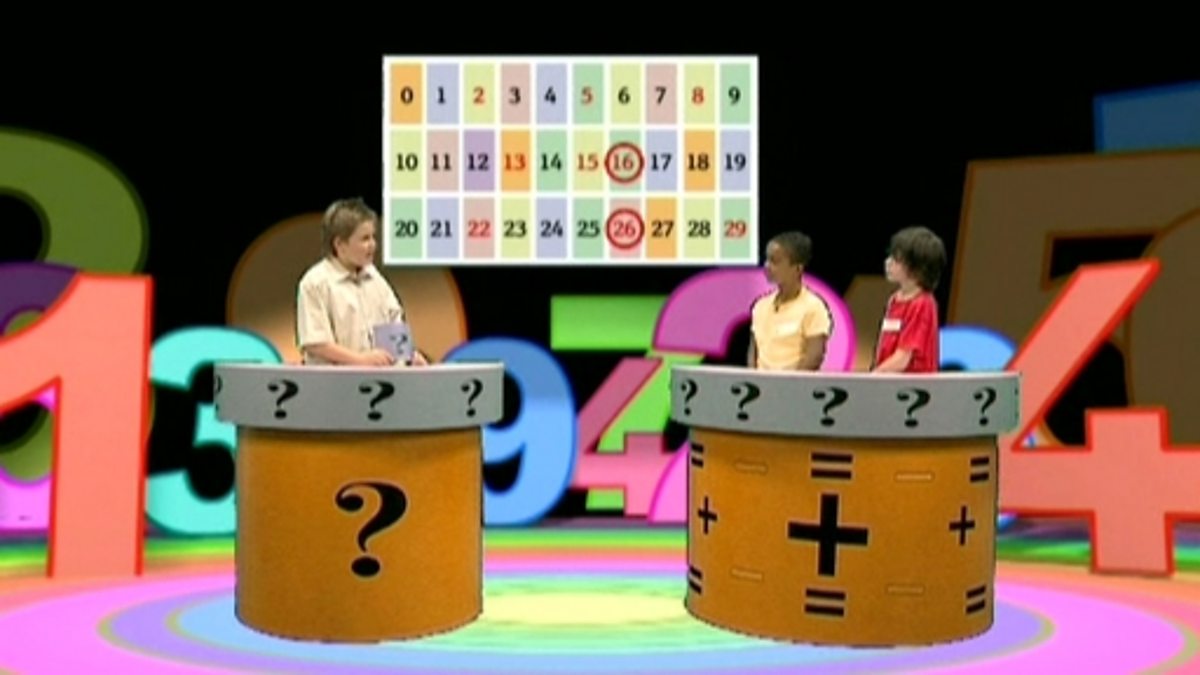 A maths quiz show using a number rectangle to show the rules of addition. Look at the number rectangle. Which number is one more than another number? Numbers on the same row have a difference of one. Can you find a number that is ten more than another number? When a number is directly underneath another number, then it is ten more. What is the easy way to find a number 11 more than another number? If you move down a row then go one place to the right, it is 11 more. What is the easy way to add 22?