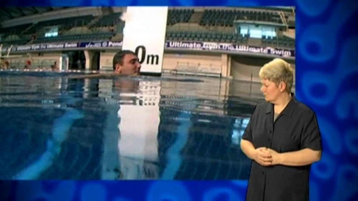 A diver is used to illustrate the concept of a negative number scale. The surface of the diver's swimming pool is set to 0 on the measuring scale. As he completes his dive, he travels from plus 10 metres to minus 6 metres and back to 0.