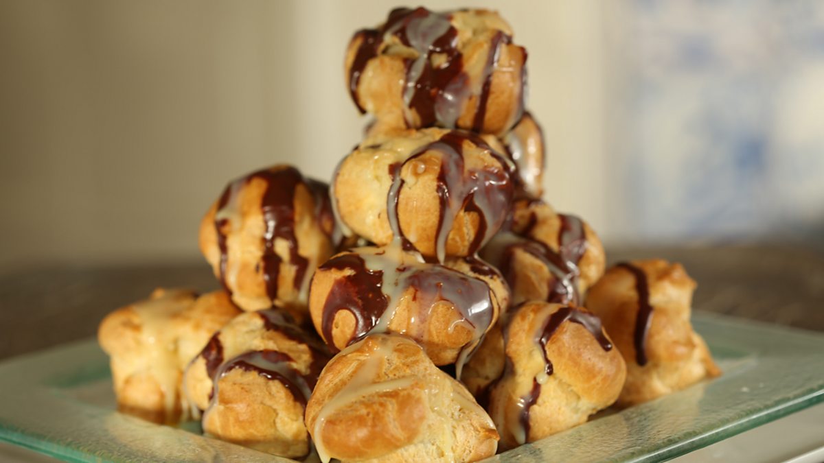 Vanilla cream-filled profiteroles with a hot rich dark chocolate sauce or a creamy white chocolate sauce. Can't decide which to have? Try both.