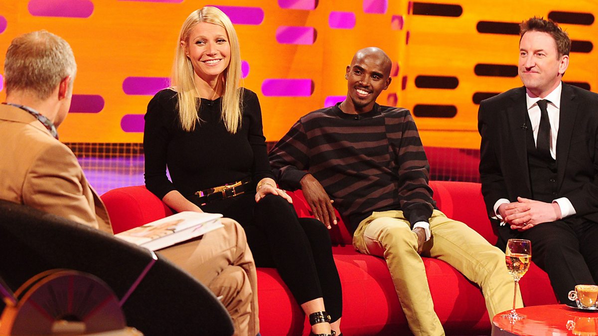 Graham jokes with Mo Farah about being out of touch because of his training and not knowing who the other guests are.