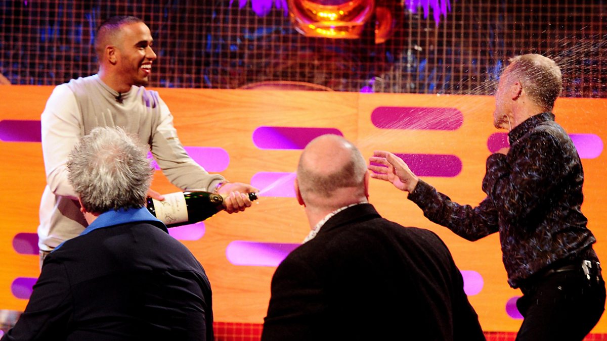 Graham gets Lewis Hamilton to demonstrate his champagne spraying skills.
