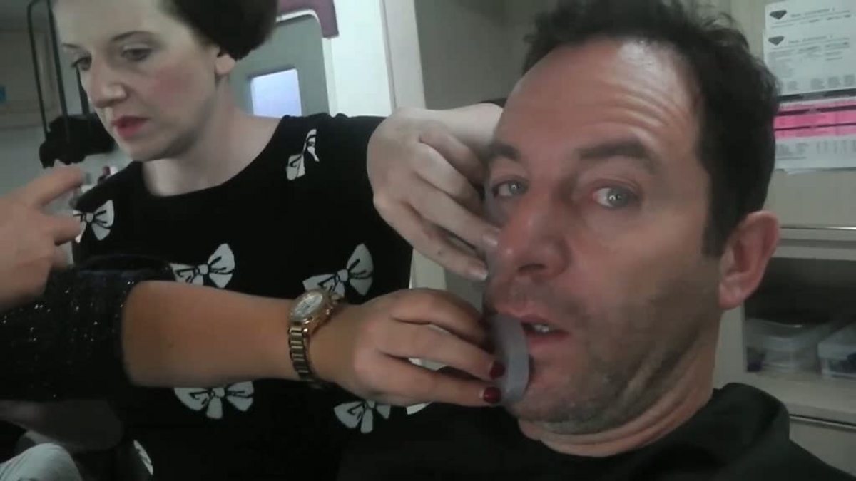 Make-up artists reveal how they make Jason look bruised and bloody, as well as showing us how they give Jason stubble with the help of yak hair.