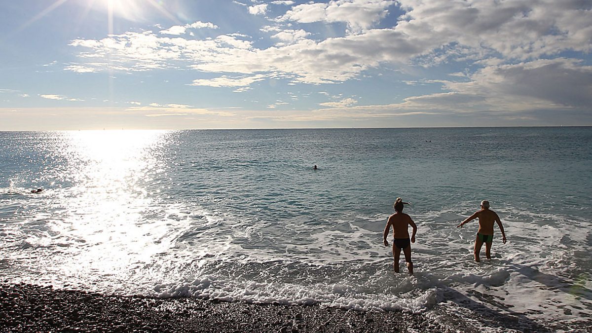 (Image: Two men walk into the sea, under a sunny sky. Credit: AFP/Getty Images)
