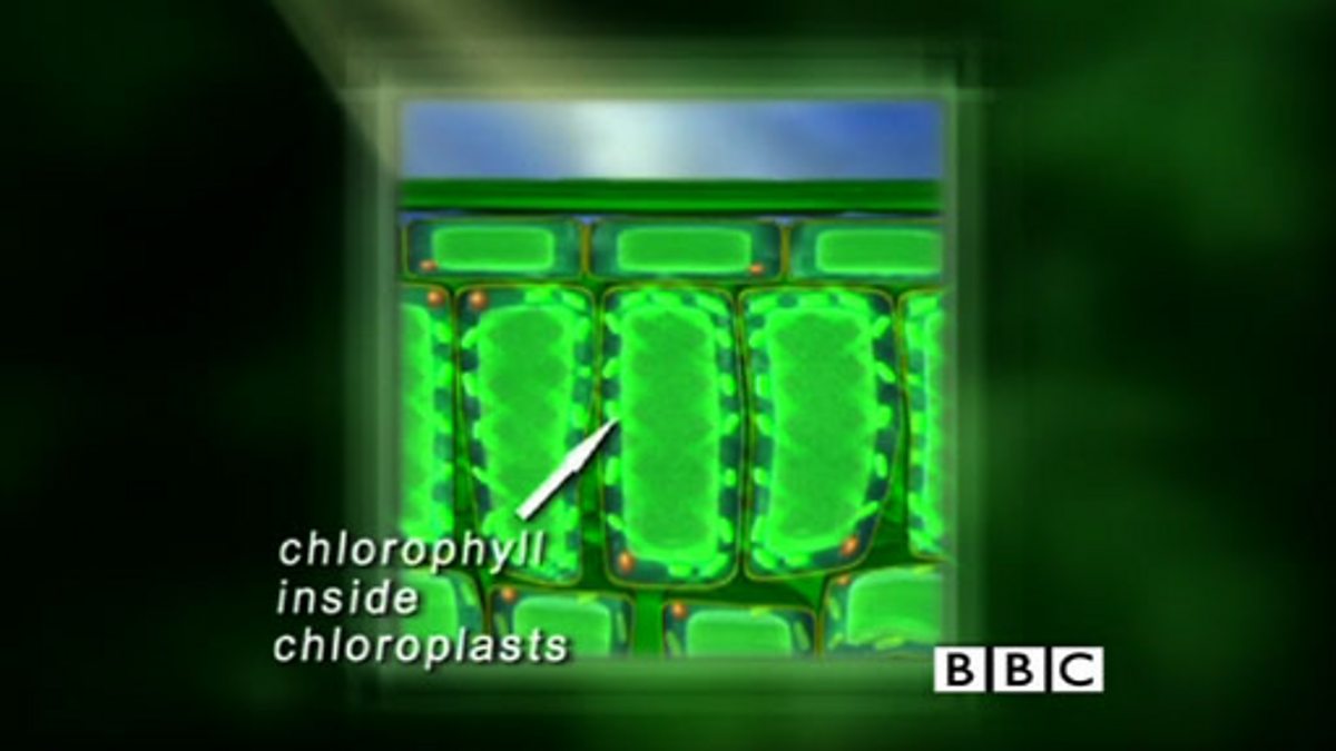 The process of photosynthesis is described as synthesis using light. The reactants and products are described and animations of leaf cells are seen. The structure of leaves is mentioned and the equation for photosynthesis is shown.
