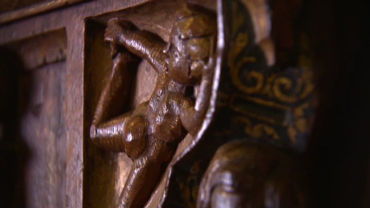 Kirsty Wark and curator Patricia Collins examine the bed head made for the wedding of Henry VIII and Anne of Cleves
