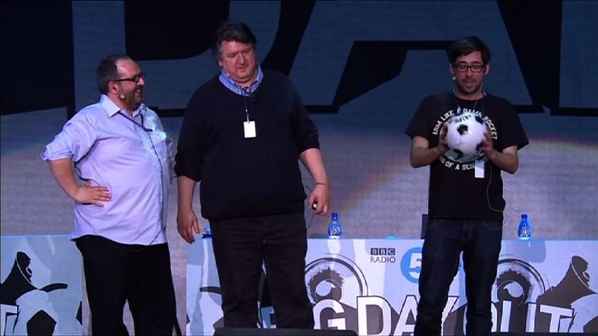 The Fighting Talk panel try for bonus points emulating Rod Stewart's kicking of footballs in to the audience.
