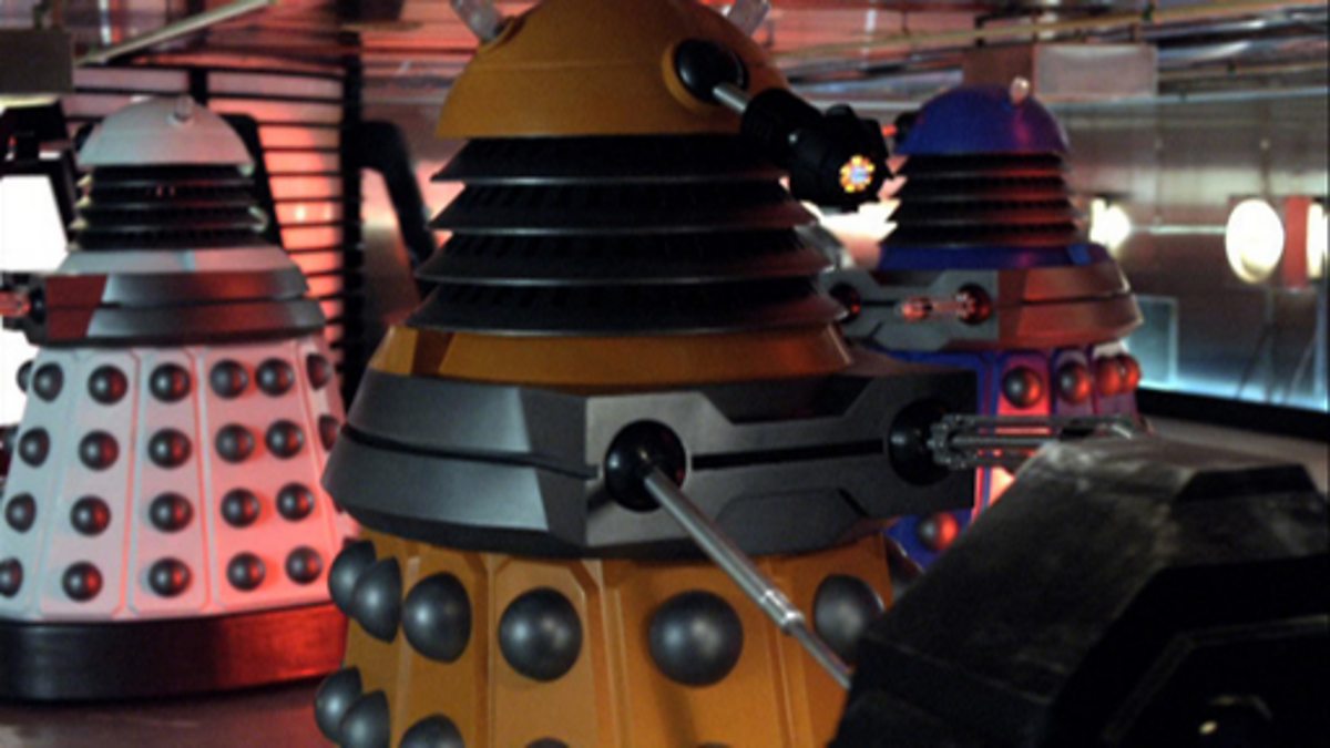 An action scene from ‘Doctor Who’ featuring the main characters and the Daleks. There are airborne space fight scenes cutting back to a headquarters. The scene creates suspense watching the Doctor and his team fight the Daleks.