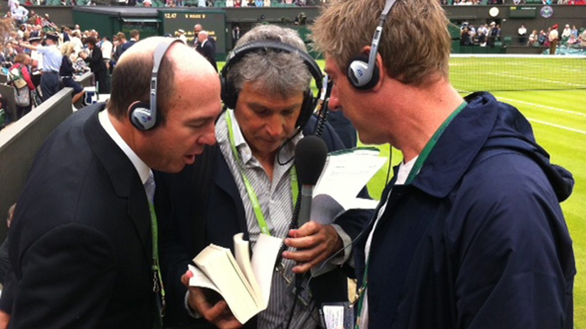 John Inverdale and Helen Skelton look in the bags of people waiting in the queue at Wimbledon. They find umpire John Blom has a copy of War and Peace.