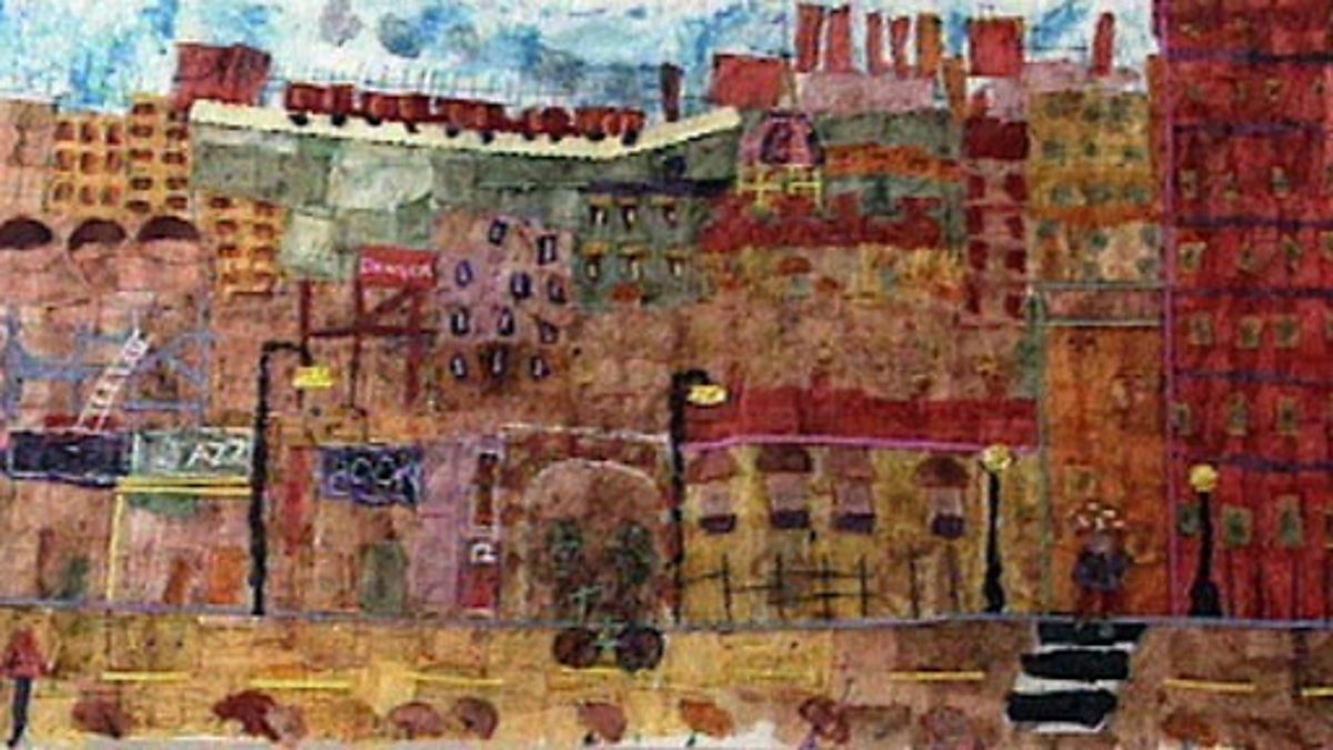 Clare Goddard shares a few of her fashion designs, such as dresses made from old teabags. She explains how teabags can also be used to create pictures. The artist takes photos of the city in preparation for a teabag picture of her local environment. Clare encourages the audience to look at the shapes and colours within their town or city and to take photos to help create their own pictures. She draws her city out on a piece of cloth and shows how she uses teabags for her work: she empties them of their contents, dips them in food colouring and allows them to dry. The dyed teabag cases are stuck on to her outline, covering large areas at first and more detailed parts are then added. Chalk and matchsticks are used to emphasise details such as signs and fences.