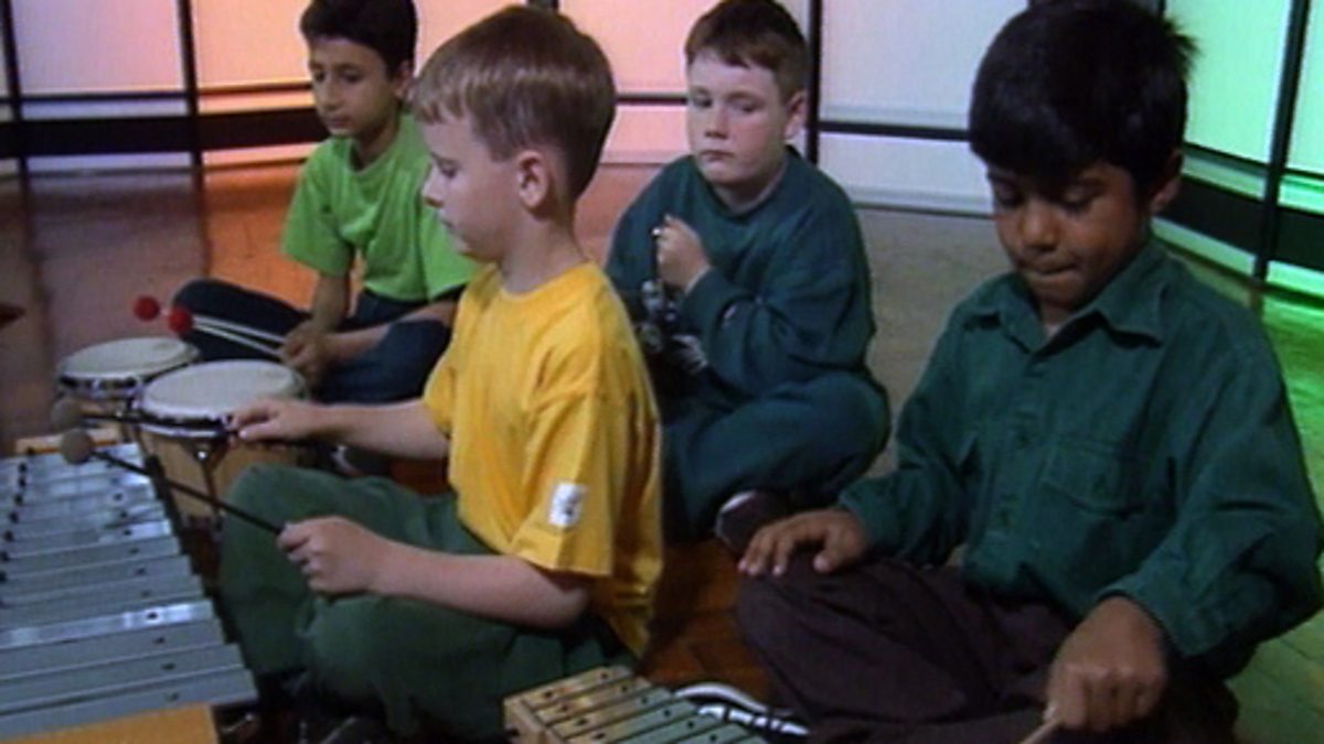 Professor Allegro presents a rhythm game based on the 'Grasshopper Hop' song. The correct rhythm must be matched to the correct picture. A group of children use percussion instruments to create insect music.