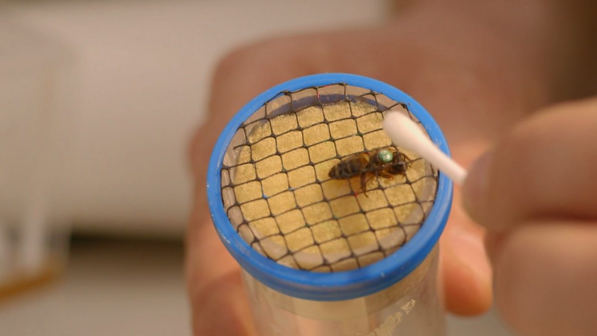 Bill Turnbull fits radar transponder antenna onto a honey bee to see if varroa mite virus affects flight.