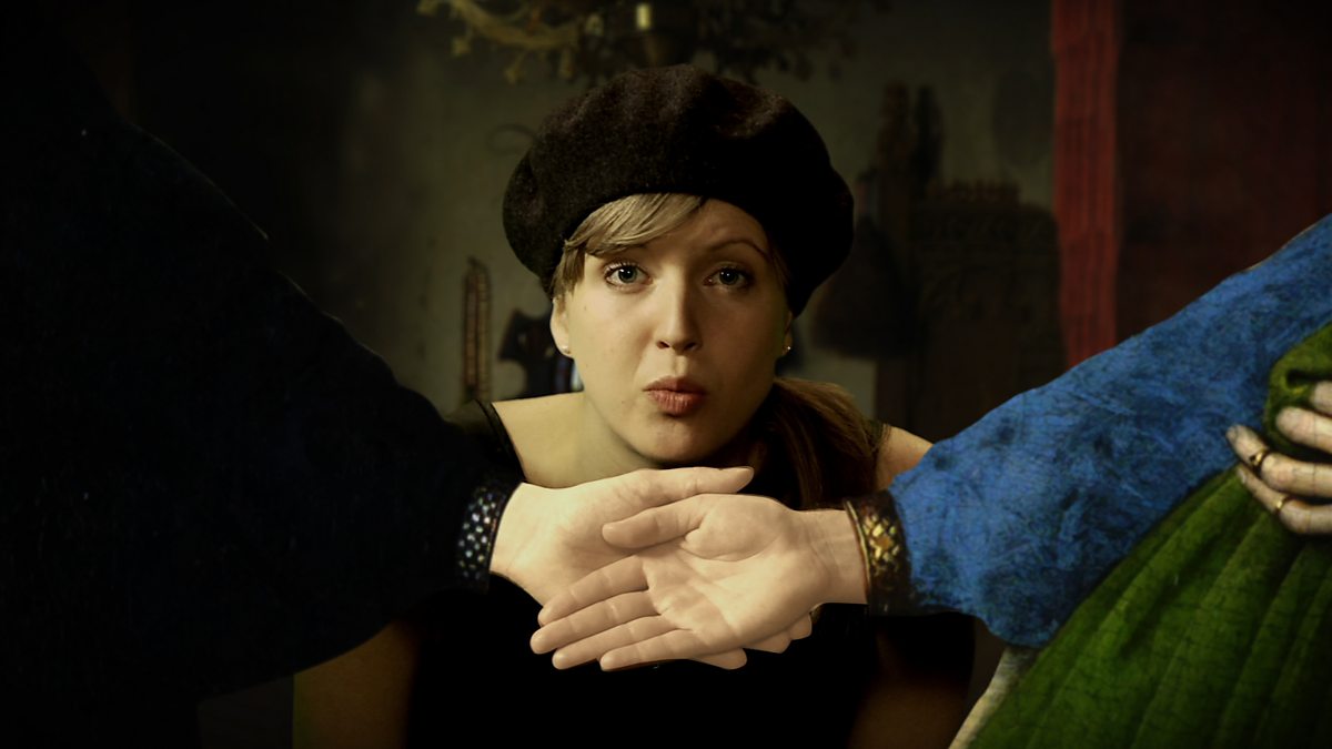 A statue comes to life in a magical gallery and climbs into the painting 'Arnolfini Portrait' by Jan Van Eyck, encouraging us to help her do some detective work. Inside the painting she explores the clues that Van Eyck painted into the picture, giving us meanings behind dogs, candles and even oranges. We learn about the techniques Van Eyck uses in his painting, and his placement within the artistic world at the time of the painting and beyond.