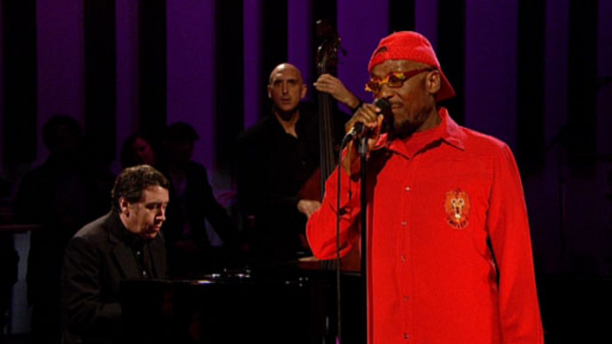 Jamaican ska and reggae singer Jimmy Cliff OM performs his own 1969 hit song 'Many Rivers to Cross'. The singer is accompanied by drums, double bass and Jools Holland on the piano. Information about the singer's roots, career development and Jamaican order of merit appear as captions on the screen during the performance.