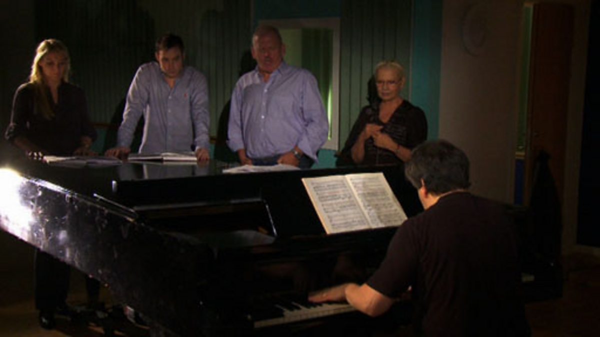 There are also shots of the chorus on stage performing the opera too. With the help of four professional opera singers, the conductor explains through performance at the piano and comments on how Puccini used devices such as a quartet of four voices singing at the same time combined with contemporary word painting to enable each character to be heard during a passionate musical passage.