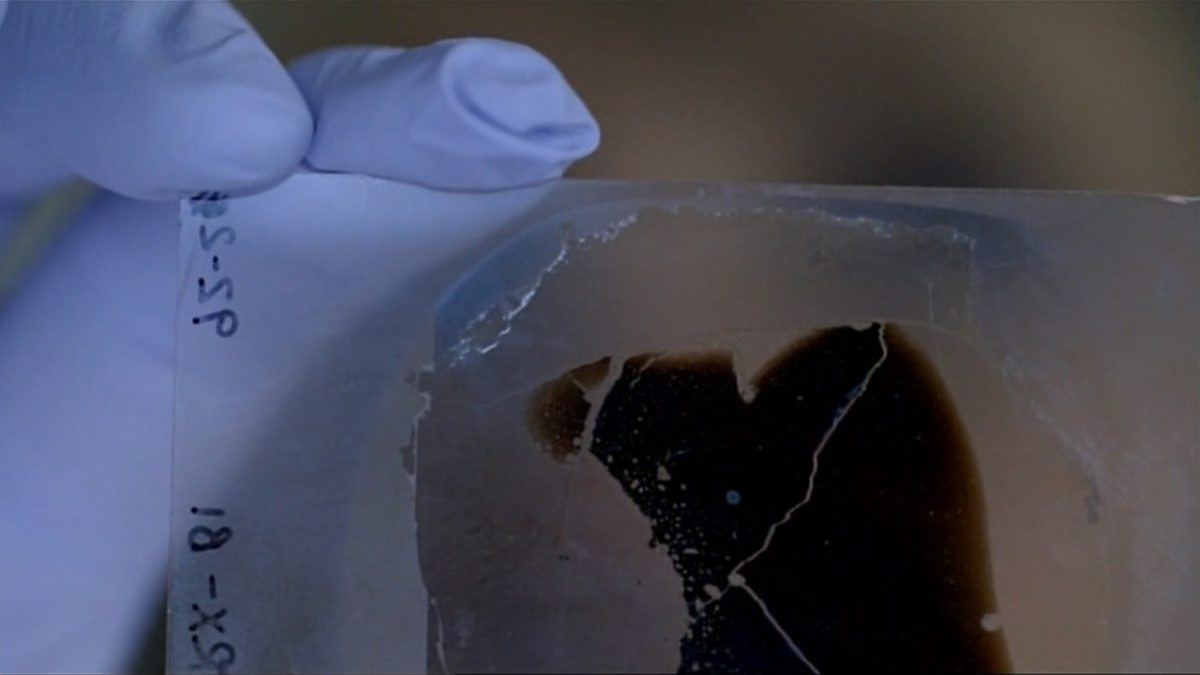 Mary's first discovery. What looked like the blood cells of a 66 million year old T-rex. Under the microscope they showed red and nucleated.