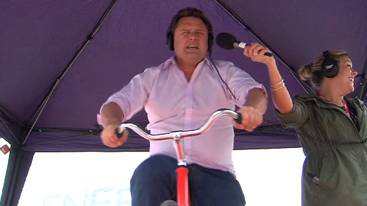 As part of 5 live's Energy Day, business reporter Dominic Laurie attempts to produce energy by cycling as fast as he can with Drive's Peter Allen and energy experts watching.
