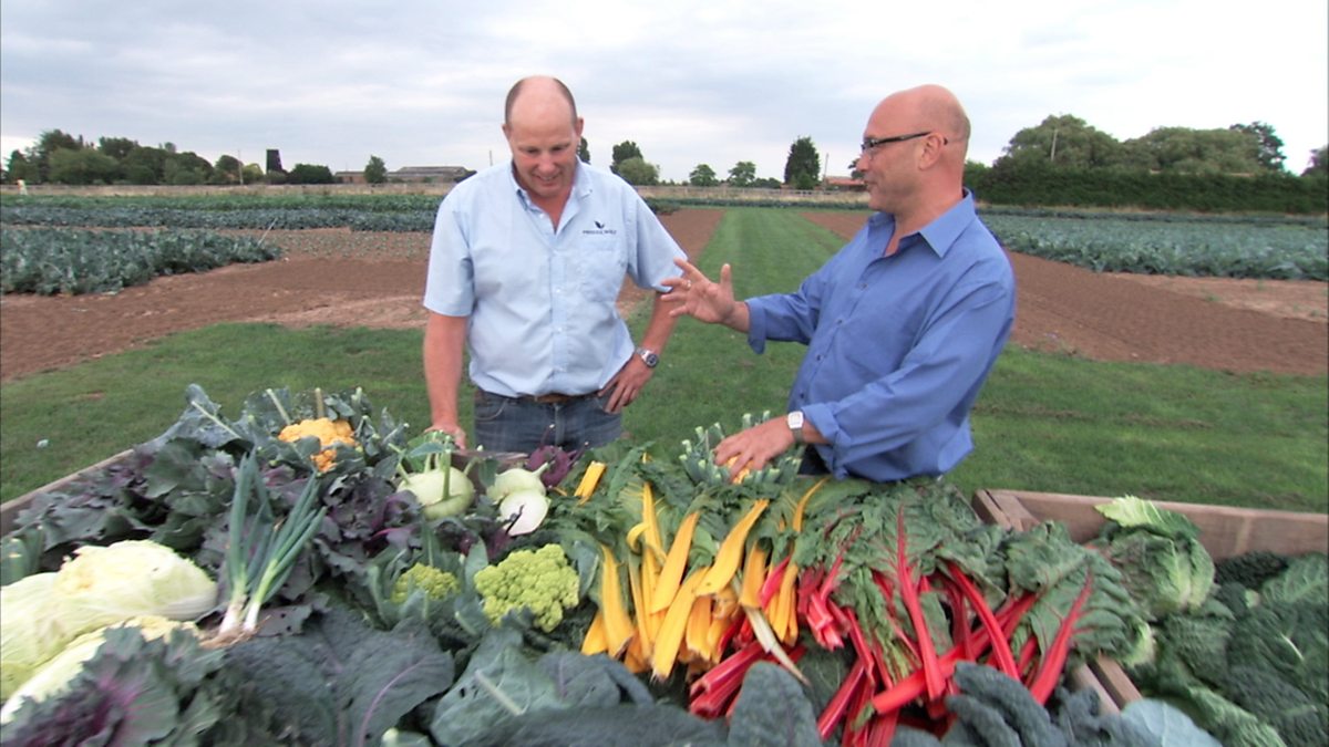 Former greengrocer Greg Wallace tries vegetables selected by farmer Andrew Burgess.