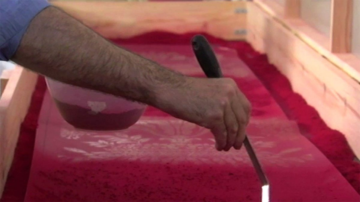 Paul Martin helps to put the finishing touches to the flocked wallpaper.