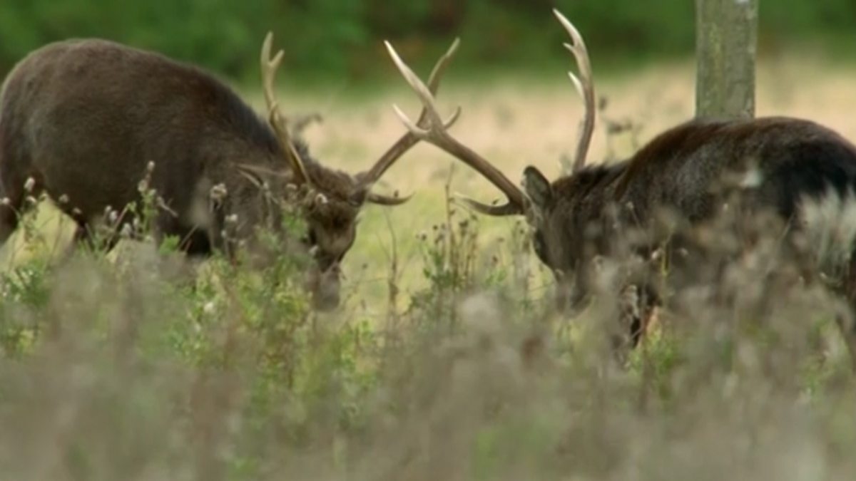 Whilst one sika stag protects his hinds, another prepares to make a challenge.