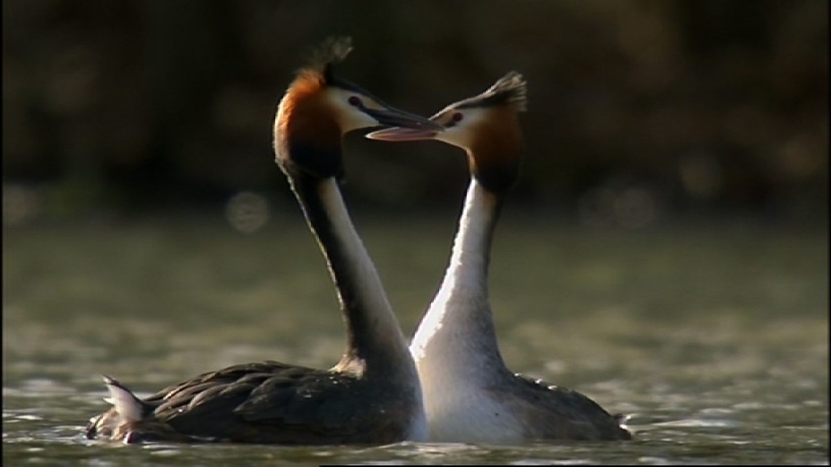 Crested grebe exhibit a beautiful and intimate courtship dance, mirroring each others movements and offering gifts.