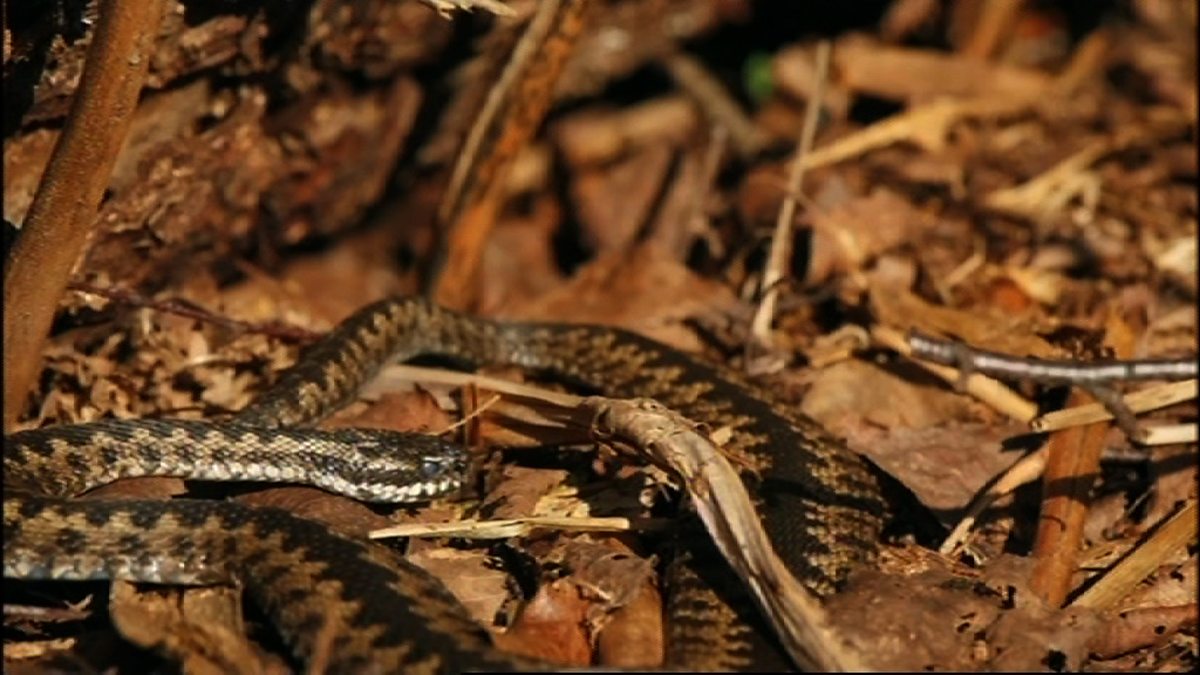 A few hours of Winter sun draw adult male adders out to bathe in the sun. In order to make the most of the sun's rays, they flatten their bodies.