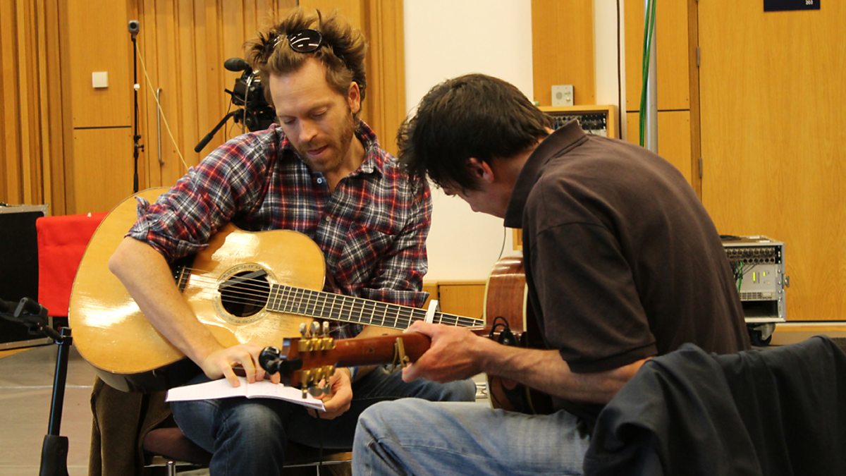 Gareth Bonello a Richard James (In Chapters) yn recordio sesiwn gyda Yves Lambert Trio.